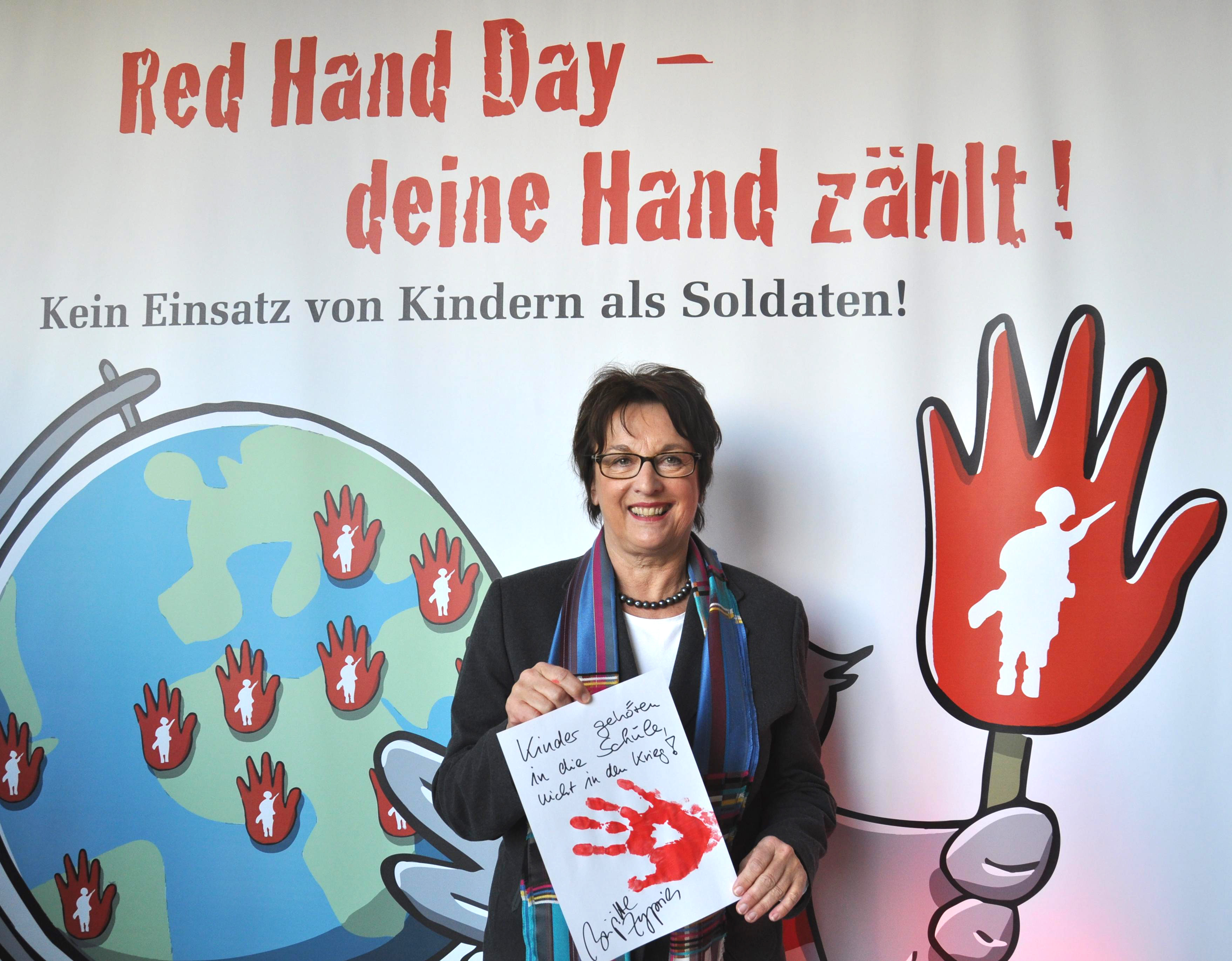 ,,Die Kinder leiden nicht nur während ihrer Einsatzzeit“, sagt die Darmstädter Bundestagsabgeordnete Brigitte Zypries, „sondern der Krieg geht für sie weiter, noch lange nachdem er beendet ist. Denn was sie erlebt haben ist so traumatisierend, dass es ihr Leben zerstört.“ Die Kinderkommission des Deutschen Bundestages hat auf Anregung von Kindern und Jugendlichen den Red Hand Day mit einem eigenen Stand im Paul-Löbe-Haus unterstützt: Am Dienstag (8.2.) hatten Politiker, Mitarbeiter und Besucher im Bundestag die Gelegenheit, ihre Handabdrücke abzugeben und so gegen den Missbrauch von Kindern als Soldaten zu protestieren. Auch Brigitte Zypries beteiligte sich: ,,Kinder gehören in die Schule, nicht in den Krieg!'' lautet ihr Statement. Nach Schätzungen der Vereinten Nationen kämpfen weltweit rund 250.000 Kindersoldaten an den Fronten als Soldaten, Spione oder Nachrichtenübermittler, davon die meisten in Afrika, Kolumbien und Indien. Initiativen wie das deutsche Bündnis Kindersoldaten fordern psychologische und medizinische Versorgung für geflohene Kindersoldaten, sowie Gewährung von politischem Asyl und eine Bestrafung der Verantwortlichen.